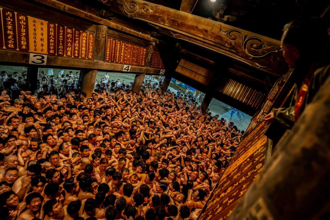 国の重要無形民俗文化財に指定されている西大寺会陽。2月の第三土曜日、西大寺観音院の本堂 御福窓(ごふくまど)から投下される2本の宝木(しんぎ)をめぐって、約10,000人のまわしを締めた裸の男たちが激しい争奪戦を繰り広げます。その様子は圧巻で勇壮そのもの。この宝木を取った者は、福男と呼ばれ、福が得られると言われています。