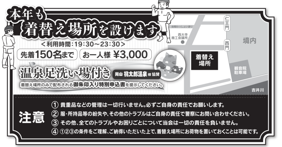 - はだか祭りには自己責任のもと参加してください。いかなる盗難、怪我、死亡等の事故に関して、主催者(西大寺奉賛会・西大寺観音院)は一切の責任を負いません。
