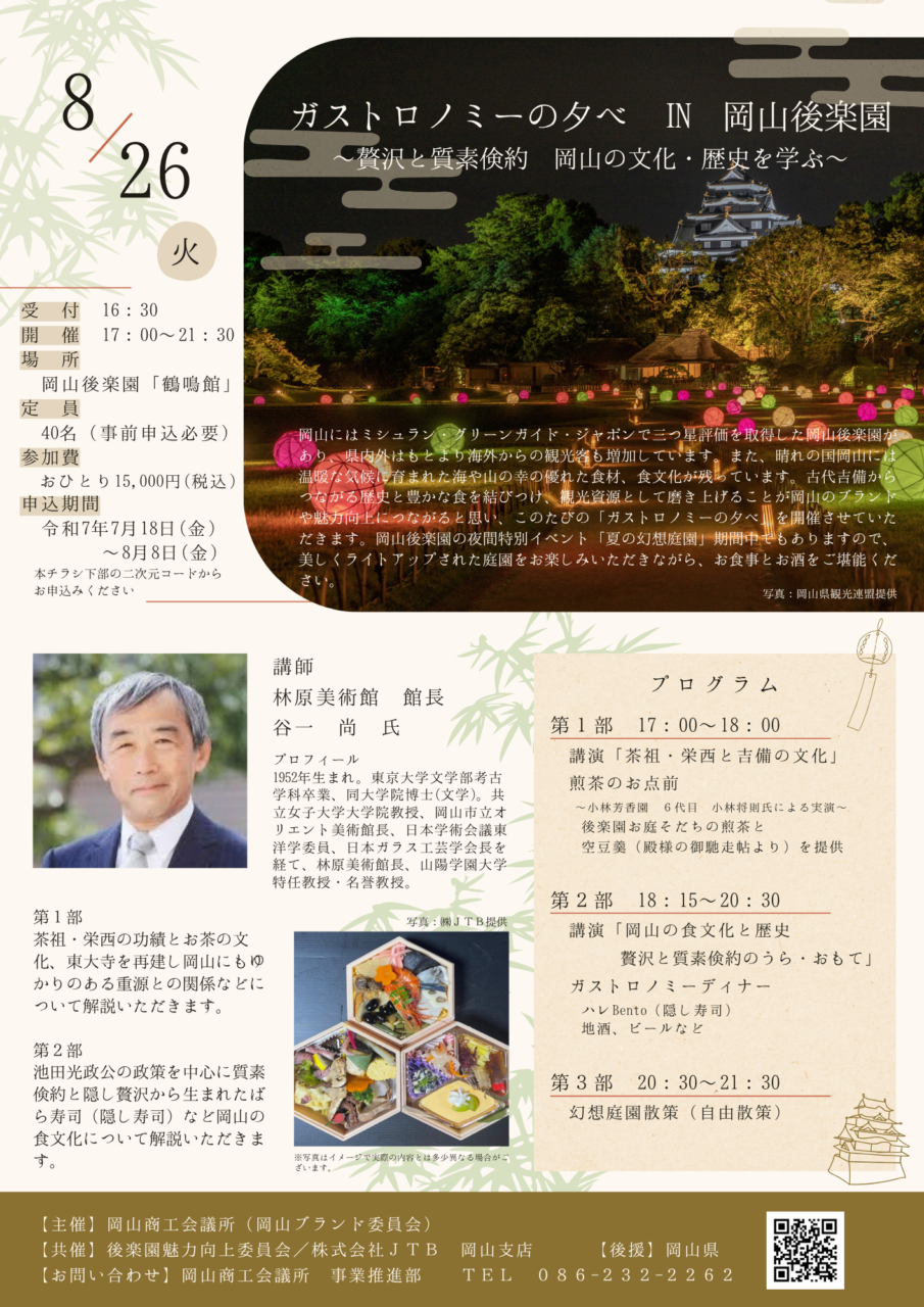 岡山にはミシュラン・グリーンガイド・ジャポンで三つ星評価を取得した岡山後楽園があり、県内外はもとより海外からの観光客も増加しています。また、晴れの国岡山には温暖な気候に育まれた海や山の幸の優れた食材、食文化が残っています。古代吉備からつながる歴史と豊かな食を結びつけ、観光資源として磨き上げることが岡山のブランドや魅力向上につながると思い、このたびの「ガストロノミーの夕べ」を幻想庭園が開催されている岡山後楽園において開催させていただきます。