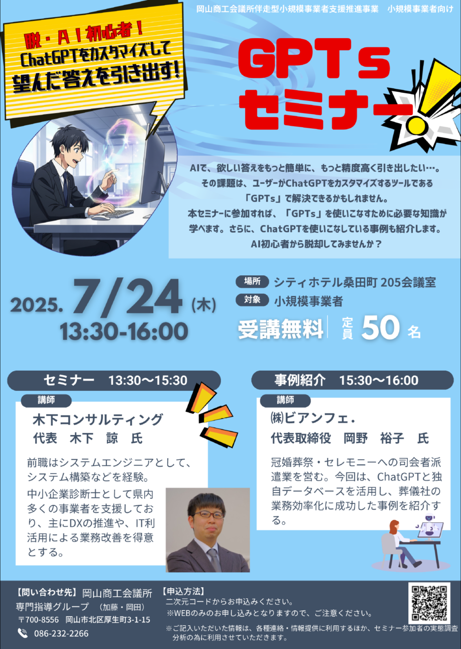 AIで、欲しい答えをもっと簡単に、もっと精度高く引き出したい…。その課題は、ユーザーがChatGPTをカスタマイズするツールである「GPTs」で解決できるかもしれません。本セミナーに参加すれば、「GPTs」を使いこなすために必要な知識が学べます。さらに、ChatGPTを使いこなしている事例も紹介します。AI初心者から脱却してみませんか?