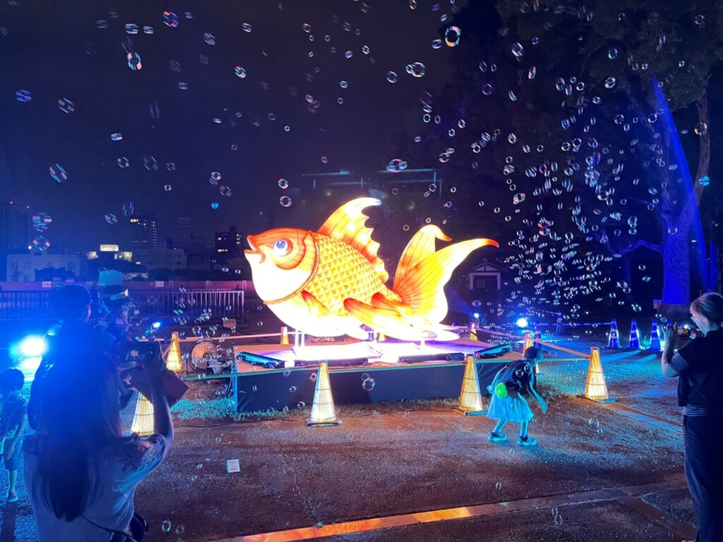 岡山のグルメやビールを楽しめる飲食ブース、家族子供たちが楽しめる縁日、大型の金魚をモチーフとしたバルーンやシャボン玉、スモークを使った涼しげで幻想的な演出で岡山城を盛り上げます。