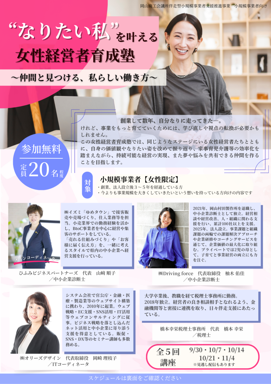 | セミナー・イベント内容 | 第1回 9月30日(火) 【わたしらしい経営スタイルと自己成長のデザイン】 ►女性ならではの制約がある中で、どのように自己実現を叶えるか 中小企業診断士:柚木 佑佳 氏 第2回 10月7日(火) 【ブレない軸と成長を描く経営戦略の作り方】 ►事業の方向性を見直し、強みを活かした持続可能な戦略を描く 【“わたし”の価値を伝えるマーケティング】 ►顧客の本音をつかみ、選ばれる理由を強化する 中小企業診断士:山﨑 順子 氏 第3回 10月14日(火) 【数字が分かれば、経営が見える!財務の基本】 ►「感覚経営」から「見える経営」へ。数字で判断できる力をつける 税理士:橋本 幸栄 氏 【共感を生むSNS・IT活用術】 ►SNS、Canva等のデジタルツールを活用し、発信力をUPする ITコーディネータ:岡崎 理枝子 氏 第4回 10月21日(火) 【人が育ち、任せられるチームの作り方】 ►「ひとりで頑張る経営」から「誰かとともに成長する経営」へ 中小企業診断士:柚木 佑佳 氏 【“経営の羅針盤”、事業計画書の作り方】 ►自分の考えや想いを言葉にして、思考の整理をする 中小企業診断士:山﨑 順子 氏、柚木 佑佳 氏 第5回 11月4日(火) 【事業計画発表会】 ►自分の考えや想いを言葉にして、参加者と共有する 【経営革新計画とは】 ►もう一段階ステップアップ、経営革新とは 中小企業診断士:福田 尚二 氏 |