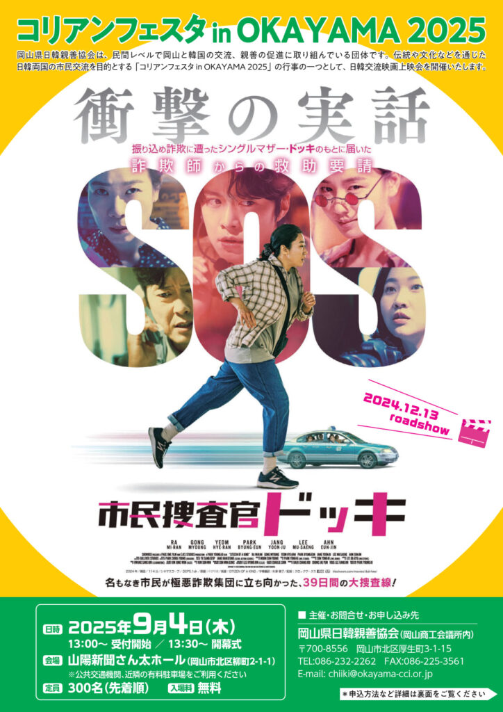 伝統や文化などを通じた日韓両国の市民交流を目的とする「コリアンフェスタ in OKAYAMA 2025」の行事の一つとして、日韓交流映画上映会を開催いたします。