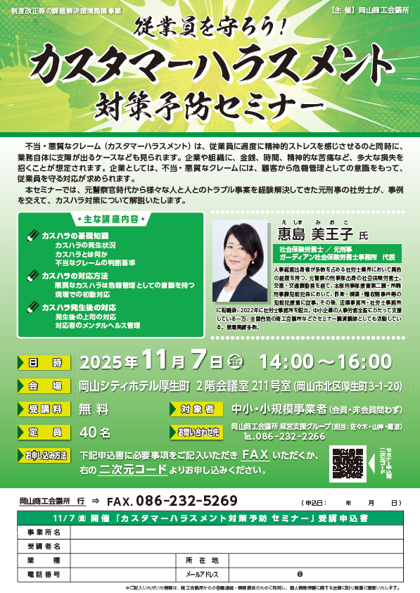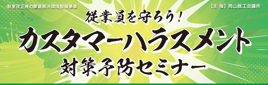 | セミナー・イベント内容 | 主な講座内容 ・カスハラの基礎知識 カスハラの発生状況 カスハラとは何か 不当なクレームの判断基準 ・カスハラの対応方法 悪質なカスハラは危機管理としての意識を持つ 現場での初動対応 ・カスハラ発生後の対応 発生後の上司の対応 対応者のメンタルヘルス管理 |