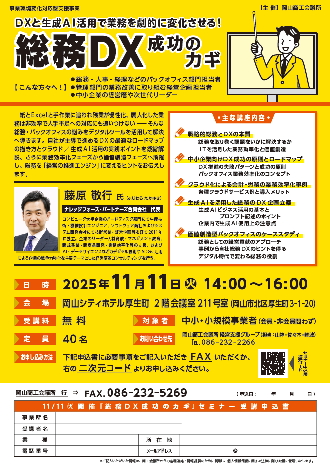 紙とExcelと手作業に追われ残業が慢性化、属人化した業務は非効率で人手不足への対応にも追いつけない ── そんな総務・バックオフィスの悩みをデジタルツールを活用して解決へ導きます。自社が主導で進めるDX の最適なロードマップの描き方とクラウド/ 生成A I 活用の実践ポイントを凝縮解説。さらに業務効率化フェーズから価値創造フェーズへ飛躍し、総務を「経営の推進エンジン」に変えるヒントをお伝えします。