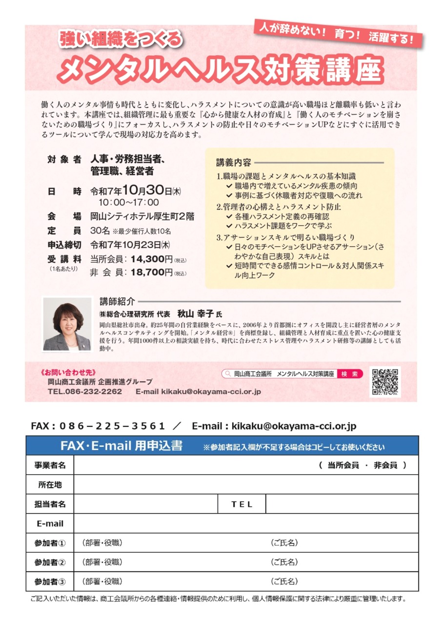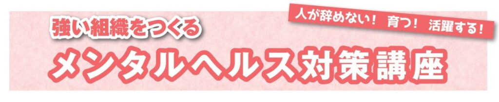 | セミナー・イベント内容 | 講義内容 1.職場の課題とメンタルヘルスの基本知識 ✔ 職場内で増えているメンタル疾患の傾向 ✔ 事例に基づく休職者対応や復職への流れ 2.管理者の心構えとハラスメント防止 ✔ 各種ハラスメント定義の再確認 ✔ ハラスメント課題をワークで学ぶ 3.アサーションスキルで明るい職場づくり ✔ 日々のモチベーションをUPさせる アサーション(さわやかな自己表現)スキルとは ✔ 短時間でできる感情コントロール &対人関係スキル向上ワーク |