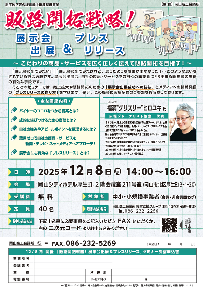 | セミナー・イベント内容 | 主な講座内容 ・バイヤーのココロをつかむ提案とは? ・成約に結びつけるための商談とは? ・自社の強みやアピールポイントを整理するには? ・費用ゼロで自社の商品・サービスを 新聞・テレビ・ネットメディアへアプローチ! ・展示会にも有効な「プレスリリース」とは? |