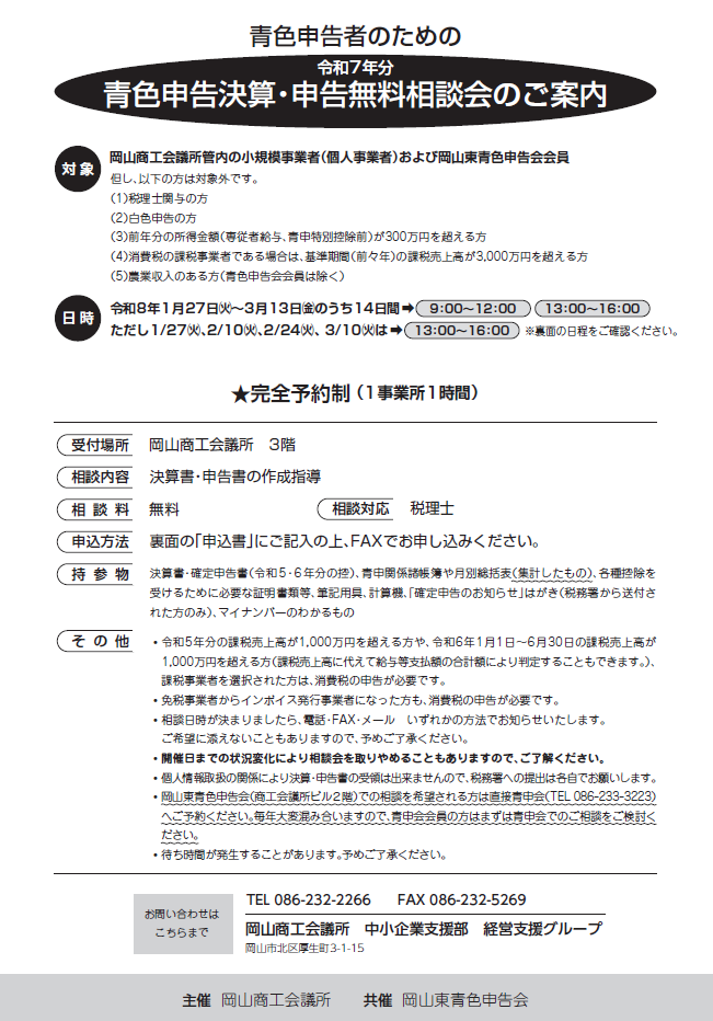 青色申告をされている個人事業者を対象とした「令和7年分の決算・申告相談会」を岡山東青色申告会と共催で開催します。