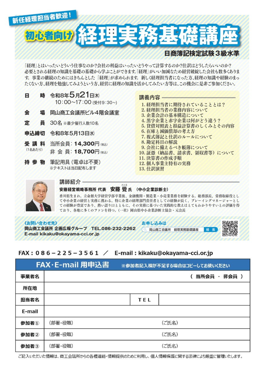 「経理」とはいったいどういう仕事なのか?会社の利益はいったいどうやって計算するのか?仕訳はどうしたらいいのか?必要とされる経理の知識を基礎の基礎から学ぶことができます。「経理」がいい加減なため経営破綻した会社も数多くあります。事業の継続のためにはきちんとした「経理」が求められます。新しく経理担当者になった方、経理の知識や経験のまったくない方、経理を勉強してみようという方、経営に経理の知識を活かしてみたい方等は、この機会に是非ご参加ください。