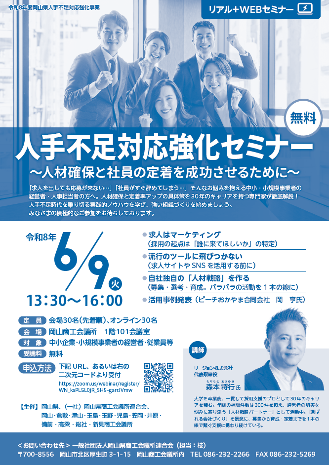 | 注意事項 | 主催:岡山県、(一社)岡山県商工会議所連合会、 岡山・倉敷・津山・玉島・玉野・児島・笠岡・井原・備前・高梁・総社・新見商工会議所 |
