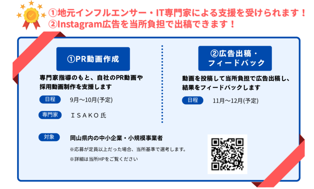 本事業では、岡山商工会議所が専門家とともに企業のPR動画や採用に関する動画作成を支援します。また、作成した動画を自社のSNSに投稿してもらい、当所負担により広告出稿し、広告結果を分析してフィードバックします。