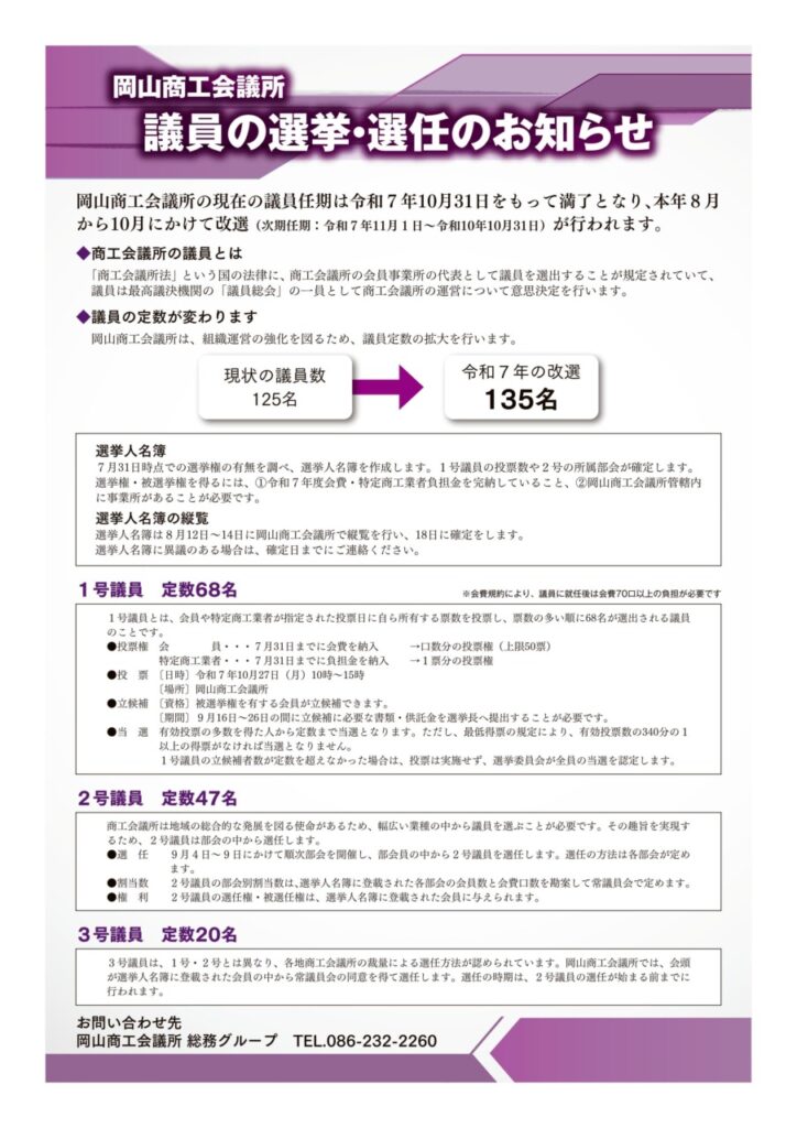令和7年は、岡山商工会議所議員の改選年です。議員選挙・選任規約に則り、3年に1回実施されます。
