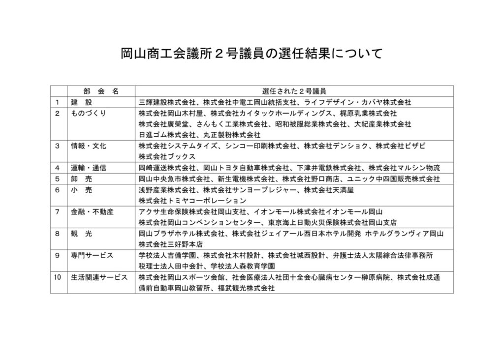 岡山商工会議所では、令和7年9月4・8・9日に2号議員選任のための部会を開催しました。すべての部会における2号議員の選任結果は、次のとおりです。